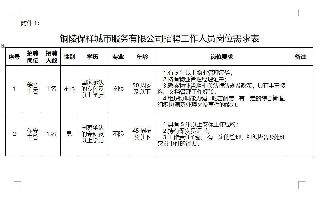 附件1:銅陵保祥城市服務(wù)有限公司招聘工作人員崗位需求表